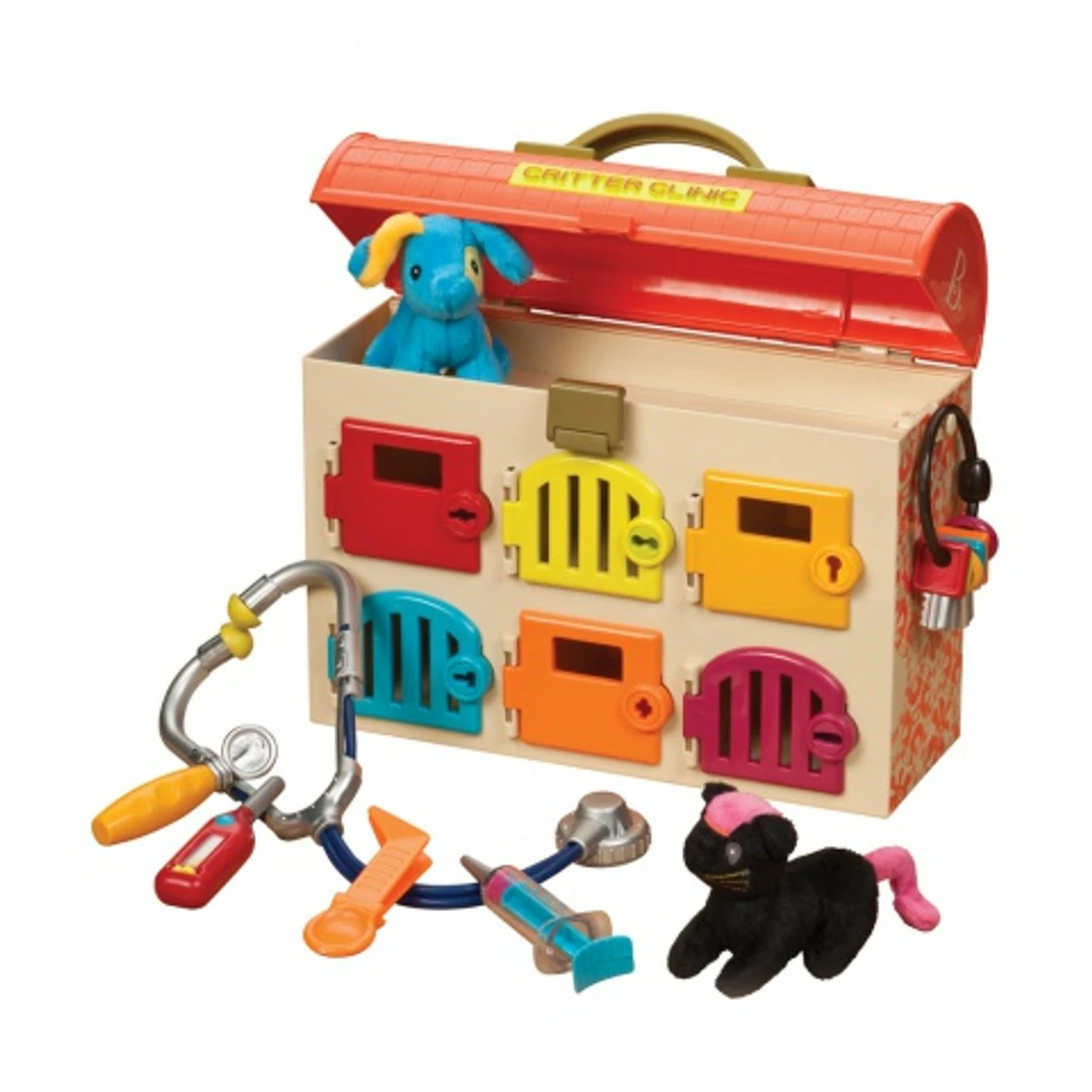 Our B. Critter Clinic features a hospital with 6 private rooms, 2 cute plush patients, color match keys and 5 tools. The stethoscope, mirror, syringe, tweezers and thermometer give you everything you need to make your “critter” all well. Packaged with a gift tag, no gift wrap required. Ages 2 to 6 years. Five vet tools store right inside includes stethoscope, mirror, syringe, tweezers, thermometer. Hospital with 6 private rooms with color-match keys. Two cute plush patients included. Color-match keys.