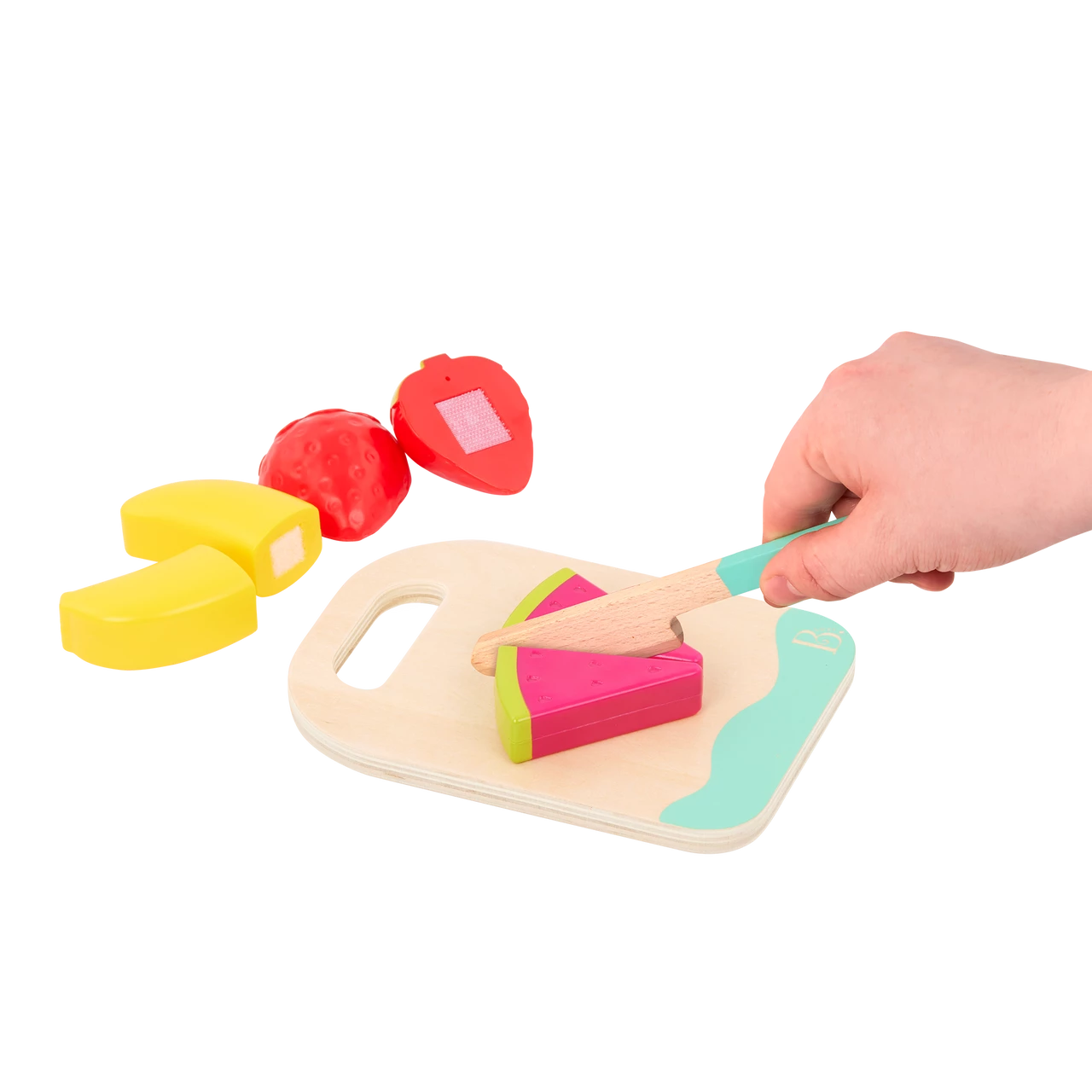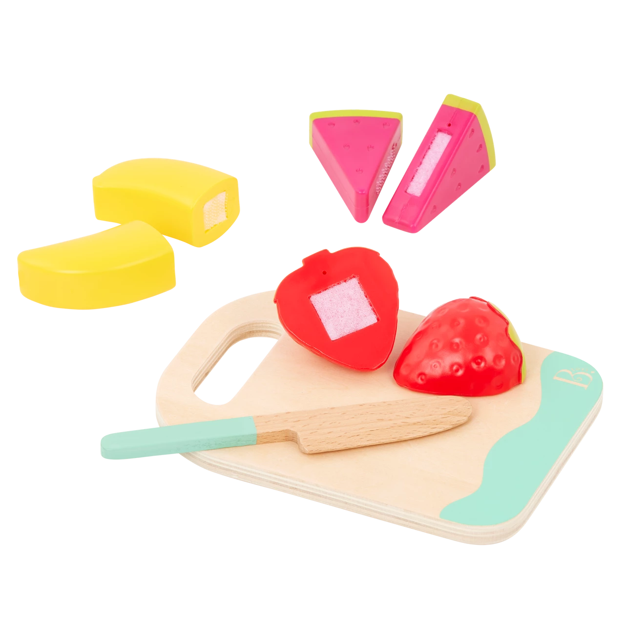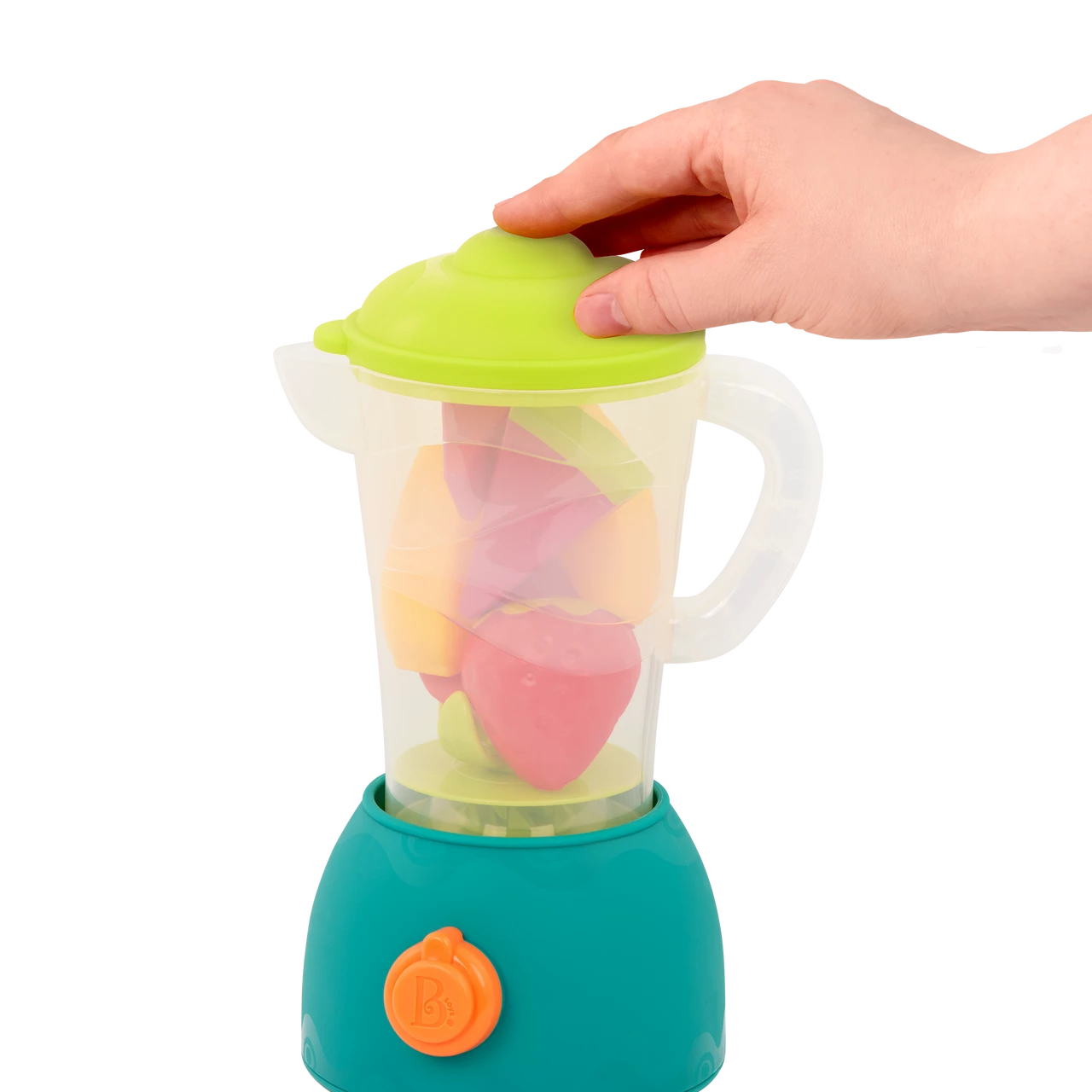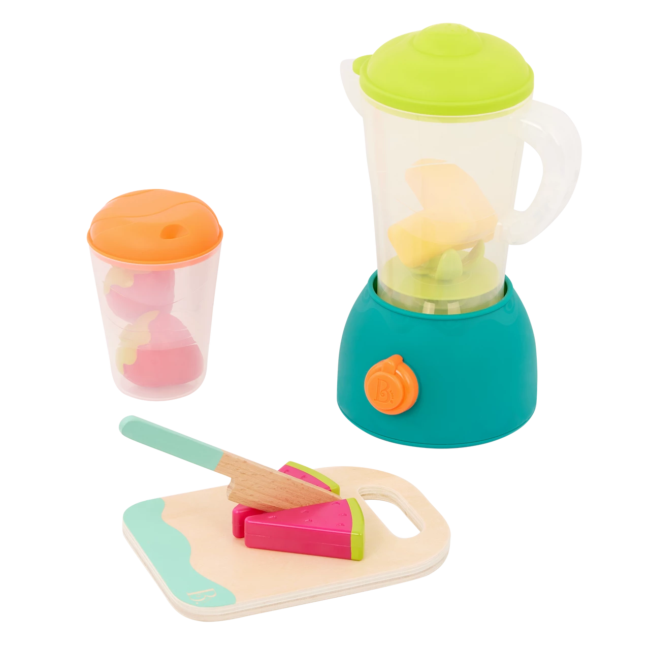 Start the day with a fruity smoothie! The Mini Chef – Fruity Smoothie Playset comes with colorful accessories that little foodies can use to blend up tons of fun in their play kitchen. Kids can grab the wooden cutting board and safe knife to chop a strawberry, a banana, or a piece of watermelon in two. The fruits go “crunch” at every slice! Children can then place the pieces in the toy blender, close the lid, and press down to watch the fruits spin. The blender is entirely kid-powered – no batteries required! The final step: pouring the pretend smoothie into the cup and ta-da! Their colorful creation is ready. All of the pieces in the set are easy for tiny hands to hold and playing with them can spark the imagination. Discover the full Mini Chef collection from B. toys to find more role-play sets for the little chef in your life! Recommended for children 3 years and over.
