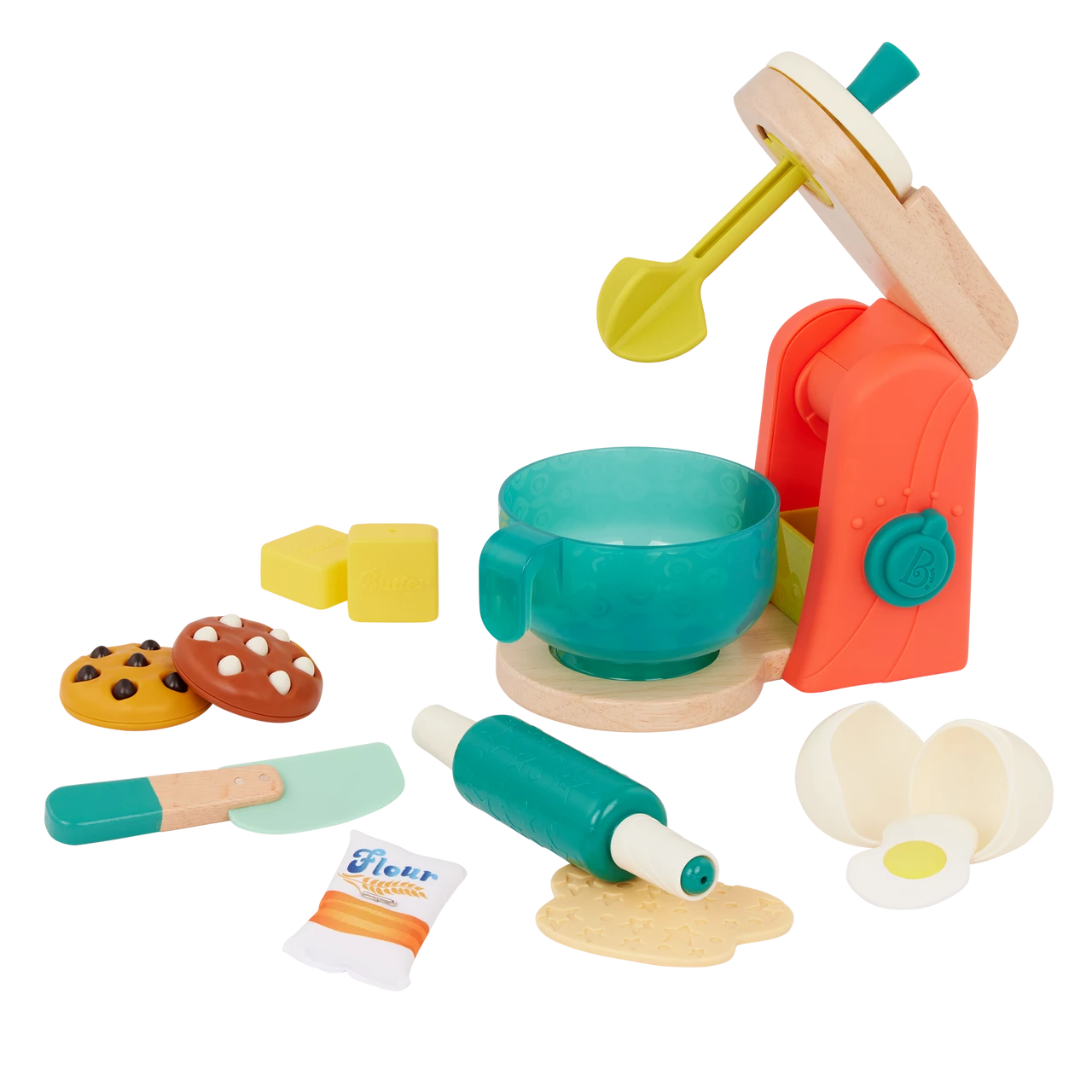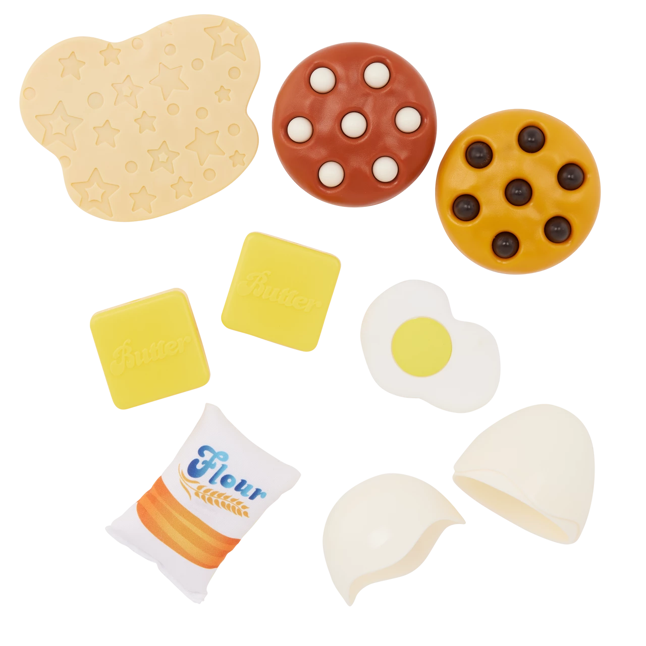 - Includes: This play food set comes with a mixer, bowl, spatula, rolling pin, piece of dough, flour bag, egg with egg shells, butter, and chocolate chip cookies.