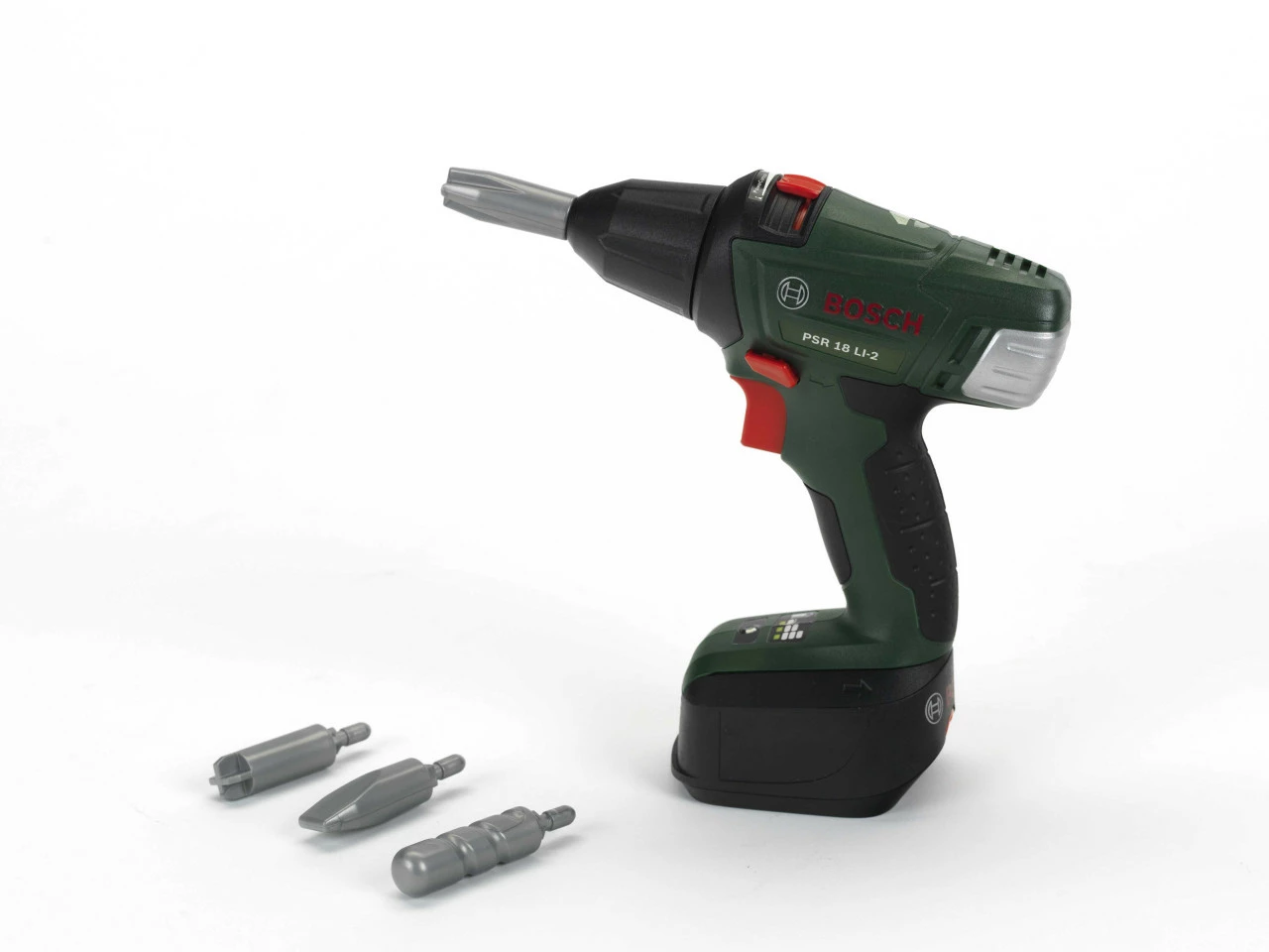 Bosch Cordless Drill/Screwdriver Toy with child-compatible functions – Battery-operated – With rotating and exchangeable bits – Right-hand/left-hand rotation – With real drilling and screwing sounds and light – Fits to all Bosch and Technico screwing systems – Original Bosch design – Suitable for children from 3 years