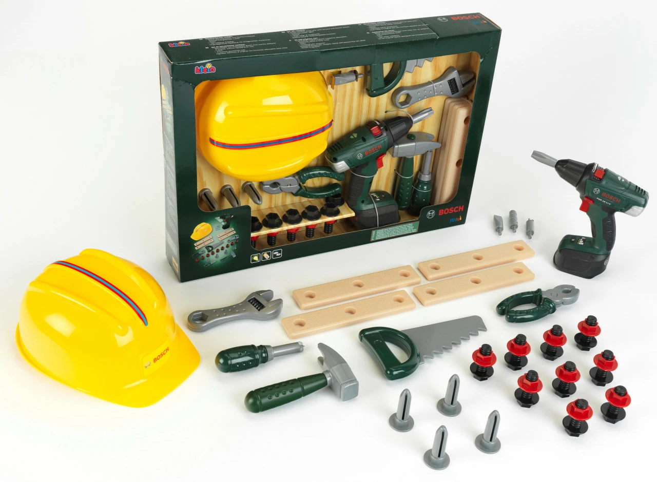 Bosch DIY Set Battery-operated cordless screwdriver II – Right-hand / left-hand rotation – With light and realistic screwing sound – Exchangeable bits Including a wide range of accessories: Helmet (adjustable size), Hammer, Saw, Pliers, Screwdriver, Adjustable Spanner, Slats, Nails, Screws and Nuts – Suitable for children from 3 years