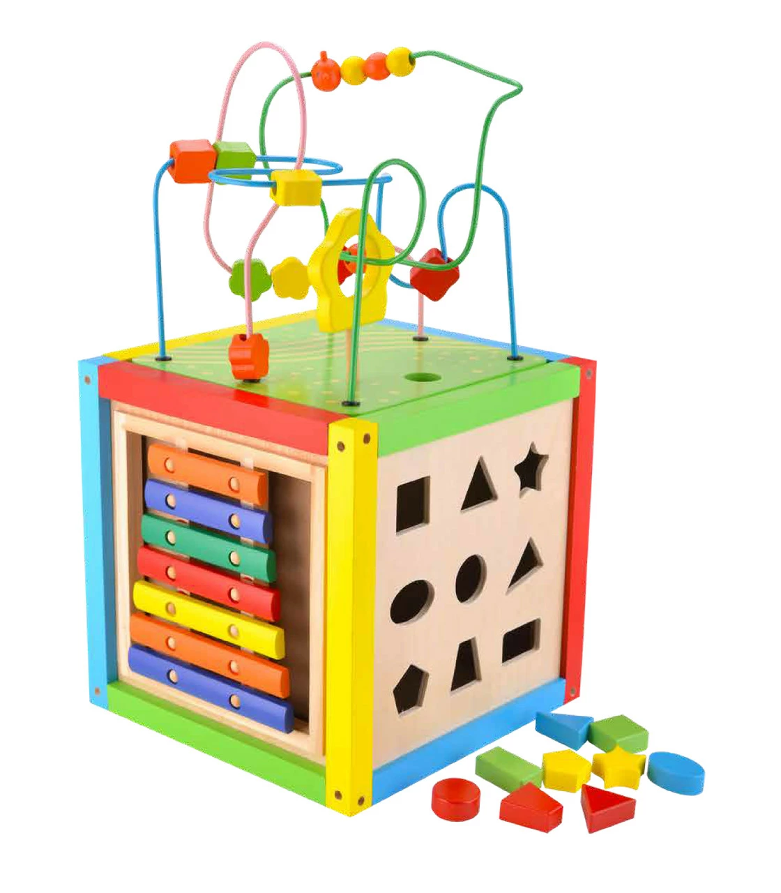 Five sides of activities for your child to explore, the Activities will help develop your child’s motor skills while learning about shapes, Sounds, and counting.