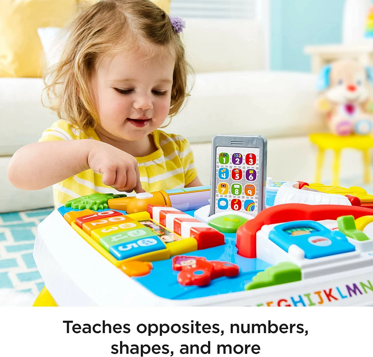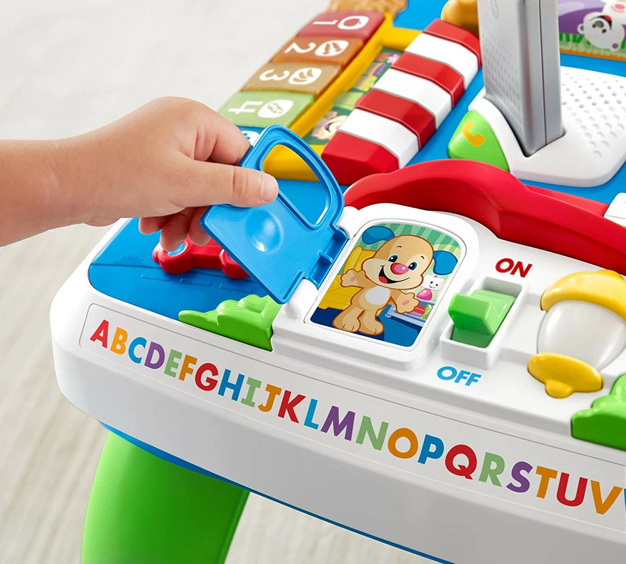 Baby will find a new place (and tons of activities) to discover around every corner of this learning table. Head to the zoo and spin the roller to hear songs about animals—or press buttons to learn shapes in English and Spanish. Take a trip to the farm and open and close the barn door to be greeted by a different farm friend. At the market, press the keys to play the piano and learn about numbers, foods, and colors. Now it’s off to Puppy’s home! Open and close the door to hear Puppy sing his ABCs, and flip the light switch to learn opposites. In the middle of the table, your little one can press the interactive button on the role play phone to make a “call” to Puppy or Sis and light up a new place to visit! And there are hands-on activities all over town to keep babies busy, including sliders, spinners, and more. You can even add legs for grow-with-me play that takes the baby from sitting & playing to standing and cruising. Every baby learns and plays in different ways. Smart Stages™ technology lets you select the stage that’s best for your child on any given day! Switch up the level to switch up the learning fun, and offer up a different variety of phrases, songs, and sounds for your little one!