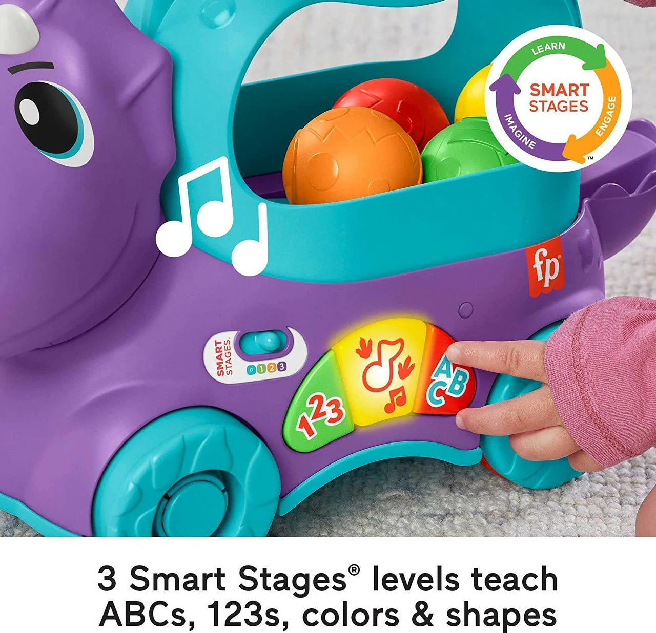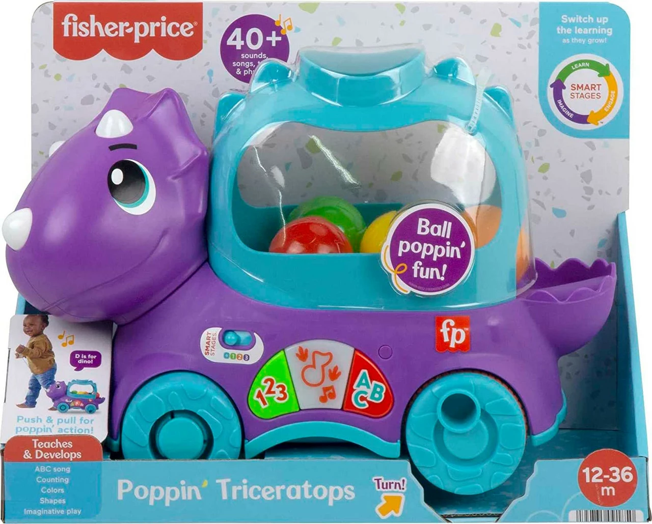 Toddlers can take a walk on the prehistoric side with the Fisher-Price® Poppin Triceratops ball popper toy. As little dino lovers push or pull the triceratops along, theyll see the colourful “eggs” pop and tumble around in the dinosaurs back. For more interactive fun, kids can press the 3 buttons to activate Smart Stages® learning songs, sounds, and phrases that teach the alphabet, counting, colours and shapes.
