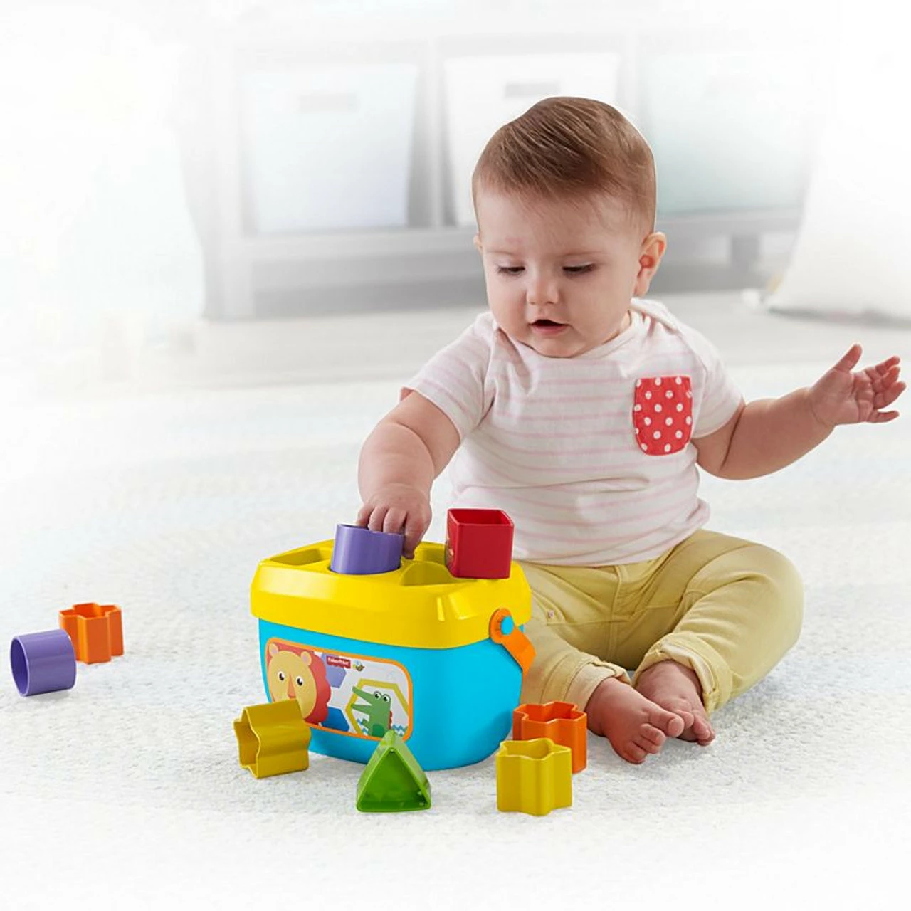 Open a bucket of fun for your little one with Baby’s First Blocks. These chunky, colourful blocks help introduce colours and shapes as babies sort, stack, and drop the blocks through the slots in the bucket lid. Empty the bucket to start the fun again and again! And with an easy-carry handle, you can take Baby’s First Blocks wherever you and your tiny tot go! Where development comes into play Fine Motor: All that block-grasping and put-and-take play helps strengthen your baby’s hand-eye coordination and dexterity. Problem Solving: Babies will exercise their problem-solving skills as they figure out how to sort and drop the blocks in the correct spots. Curiosity: All the bright colours and fun shapes help to engage your baby’s natural sense of curiosity during playtime.