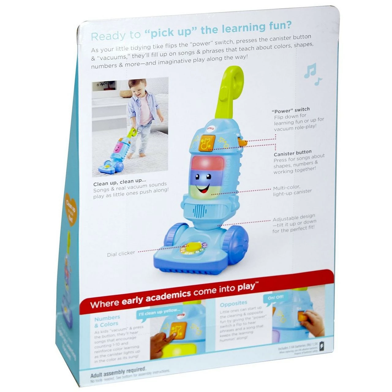 - Flip the switch “on” for vacuum sounds; switch “off” for learning songs and phrases that teach colors, counting, and more.