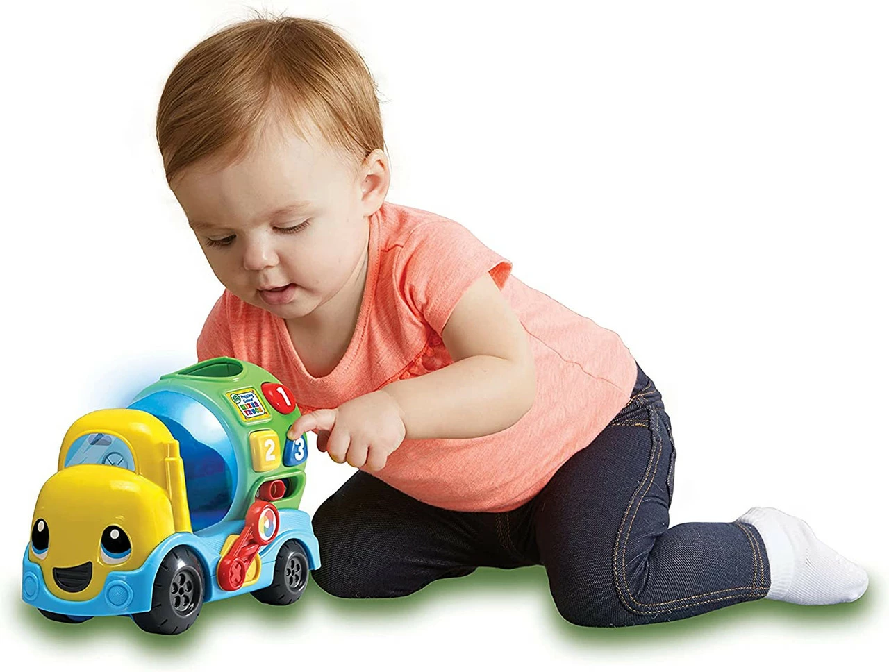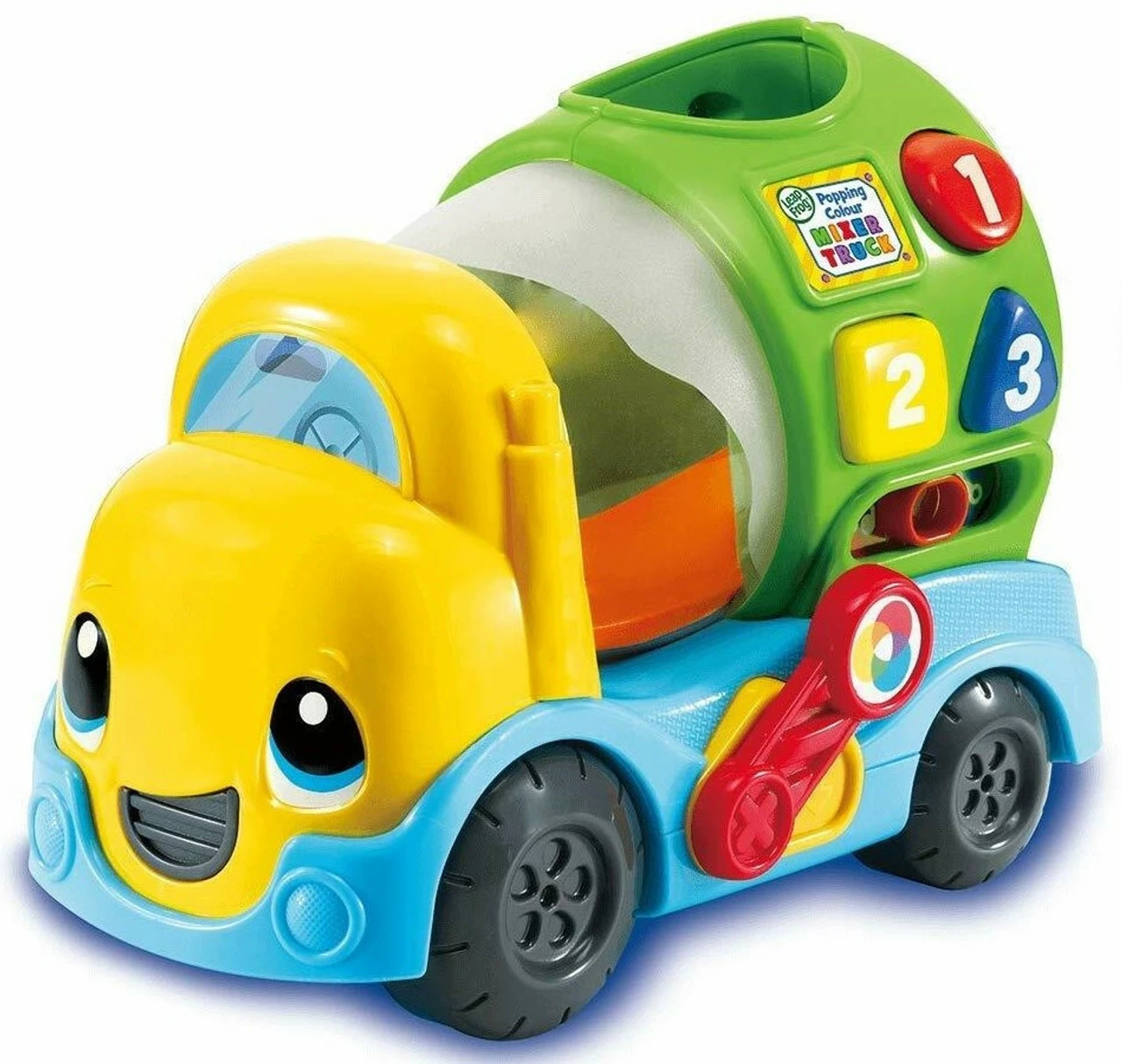 The LeapFrog Popping Color Mixer Truck toy makes building fun. Children can drop the balls into the toy truck to activate the lights. Watch the mixer change colour, then add two balls to it and push the lever to combine the colours. To learn colours, shapes, and numbers, press the colourful shape buttons. Kids can use the buttons on the LeapFrog Popping Color Mixer Truck to answer questions or add sounds and music.