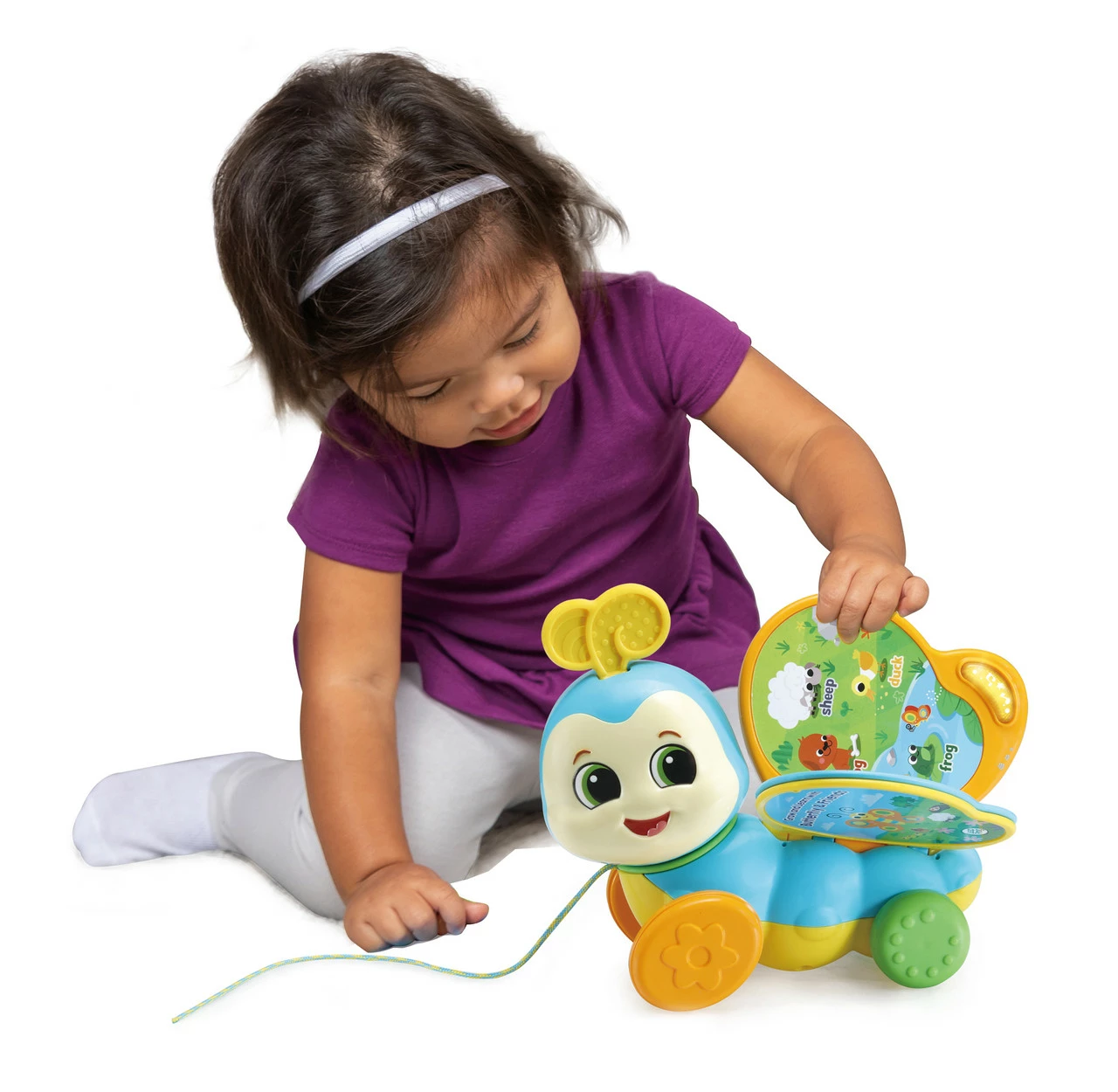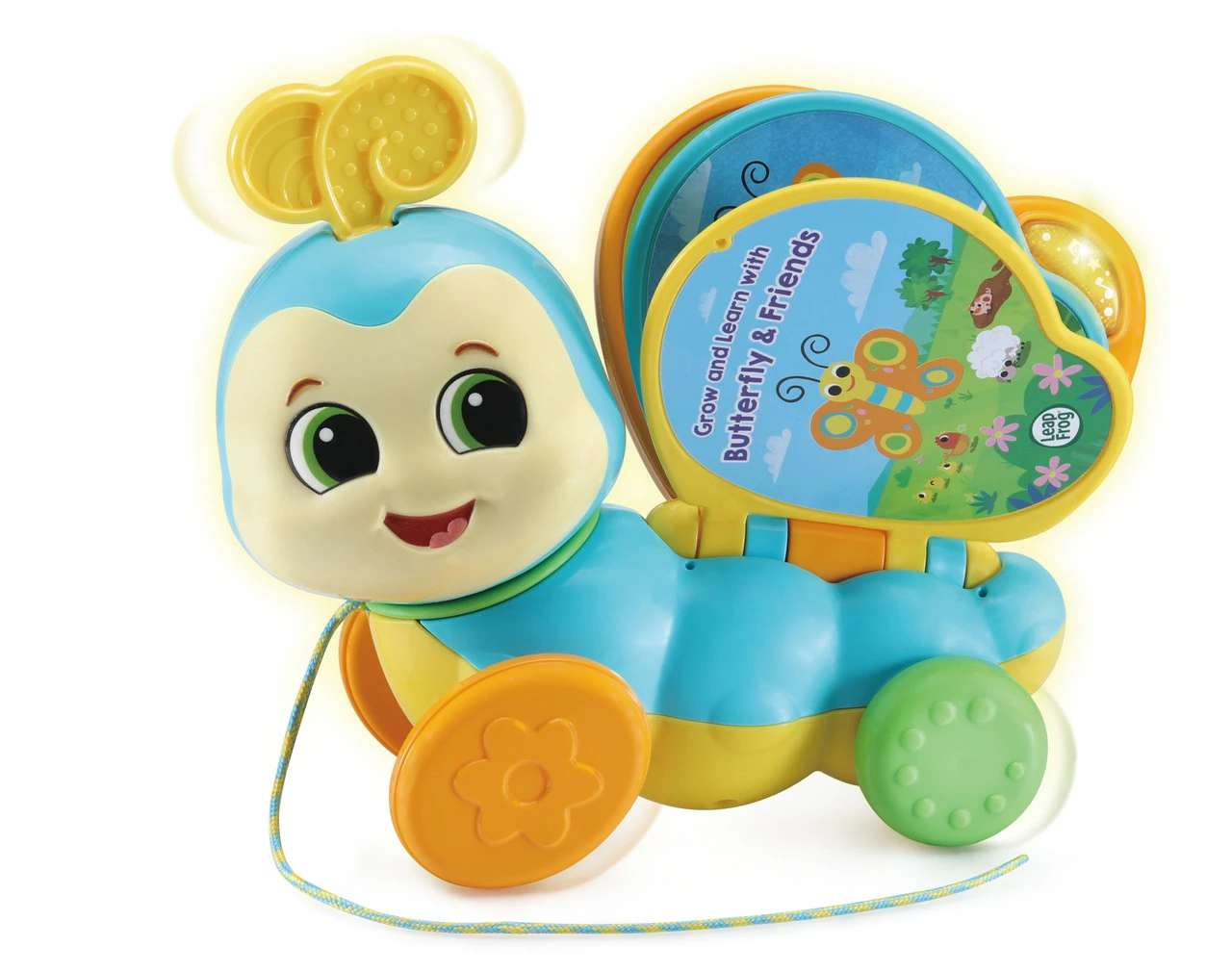 Butterfly pull toy has a detachable, interactive book for little ones to learn about butterflies, animals, colours and counting. Pull the butterfly by its cord to activate music, sounds and light effect