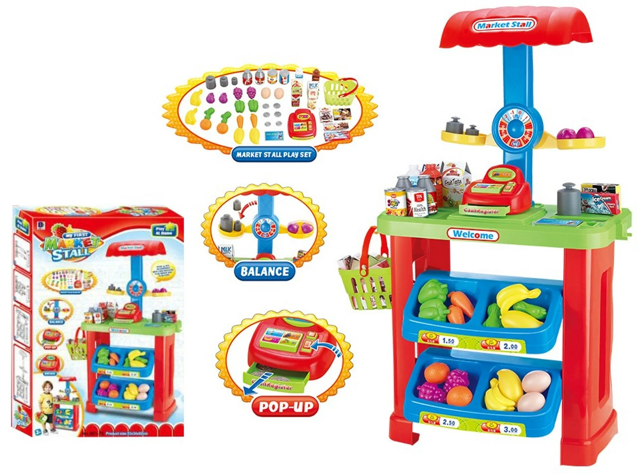 Market stall play set, over 44pcs with cash register,play money and play food. size around 53*34*82cm after assembled