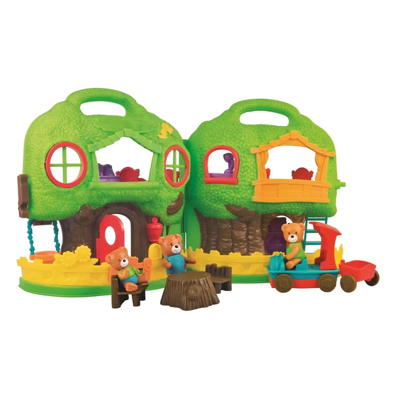 1 Take along house, 1 poseable papa bear, 1 poseable mama bear, 1 baby bear, 1 free wheeling buggy with attached kiddle car, 2 beds, 2 bureaus, 1 table, 2 chairs, 1 fireplace, 1 tree swing & 1 tree house ladder