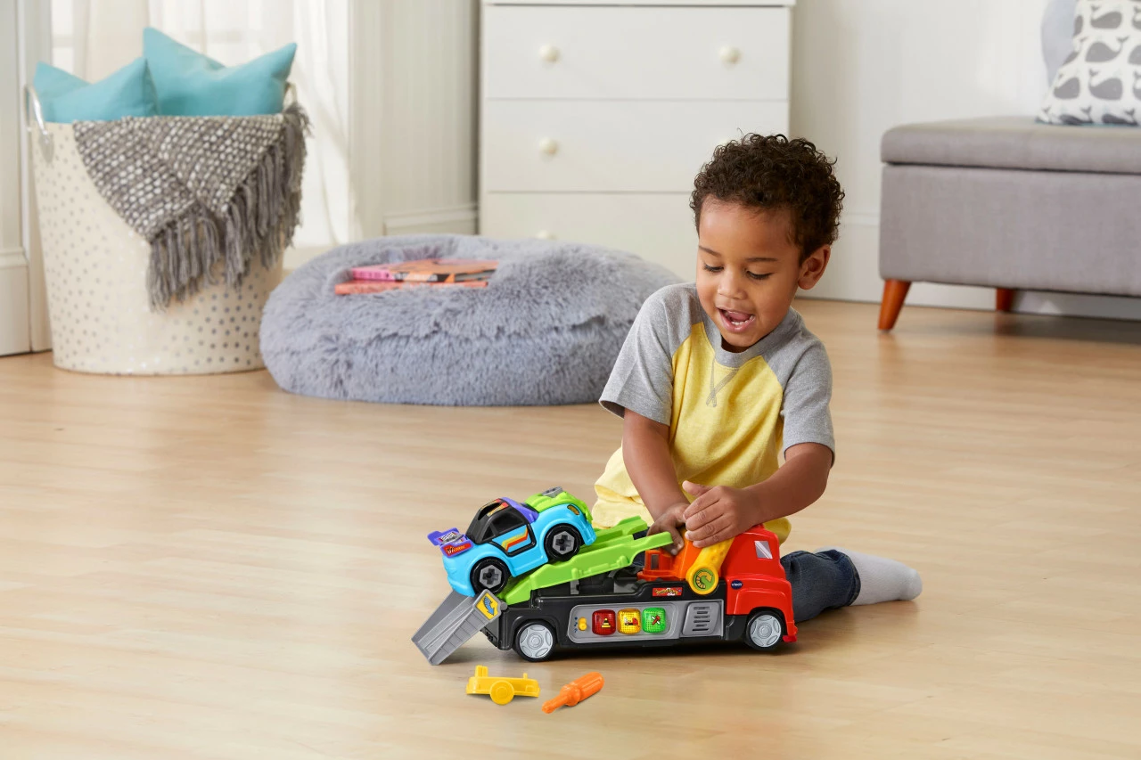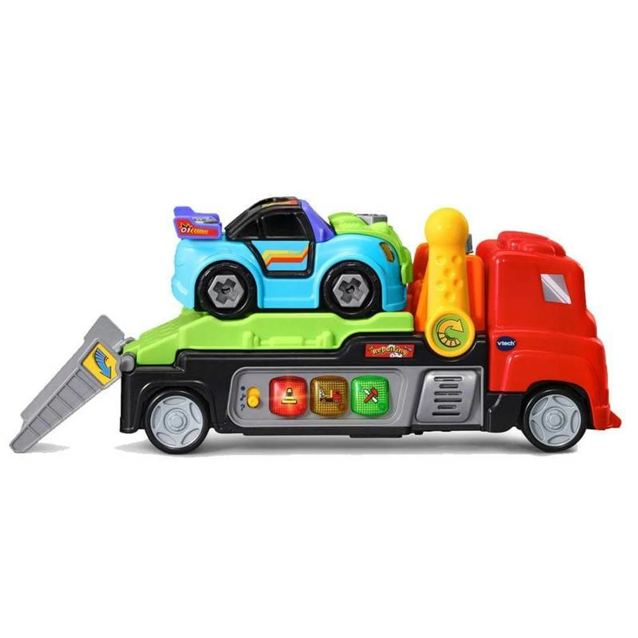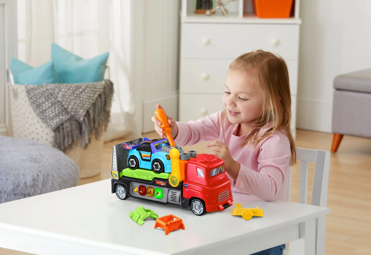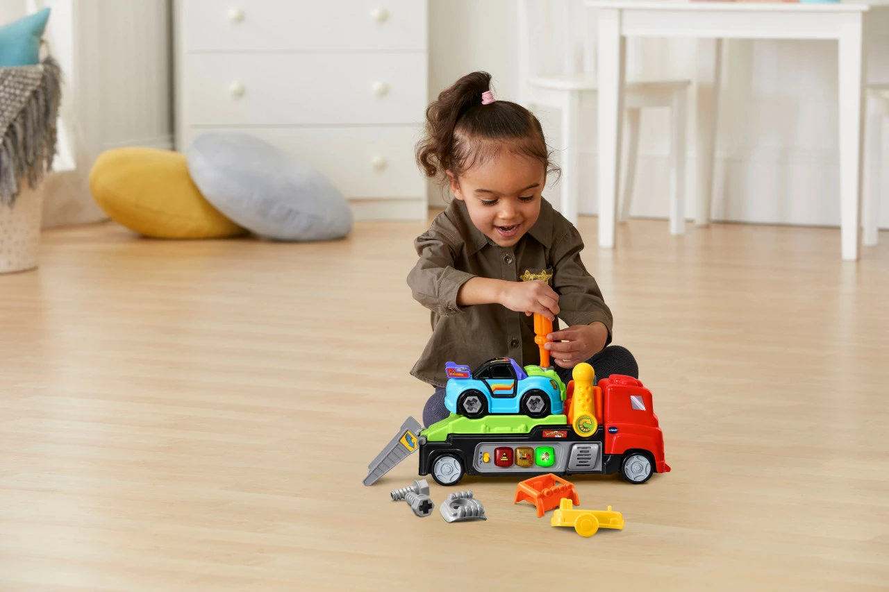 Ready to customise! The Fix & Learn Car Carrier by VTech® is an interactive car carrier that recognises different accessories when they are added to his cute car friend! Through guided play the carrier will ask your little one to add accessories to build the car in a variety of cool designs. Adding the accessories will trigger awesome sounds and phrases, place the car on the car carrier to hear the vehicles talk to each other. Press the light up buttons to explore the car carrier, car, road safety and colours. Even find particular accessories to build and customise cool cars in Challenge Mode.