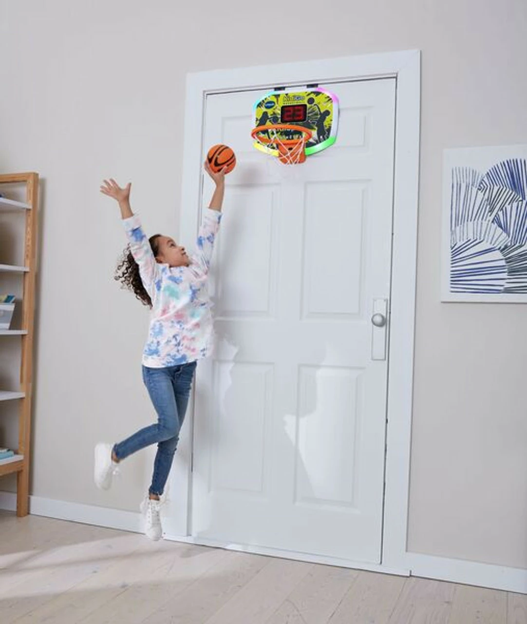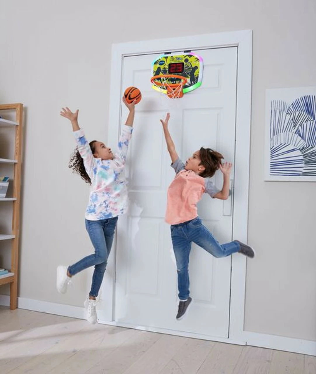 Jump into action with a basketball hoop, 4.7″ basketball and interactive scoreboard that lights up, keeps score and cheers you on as you play.