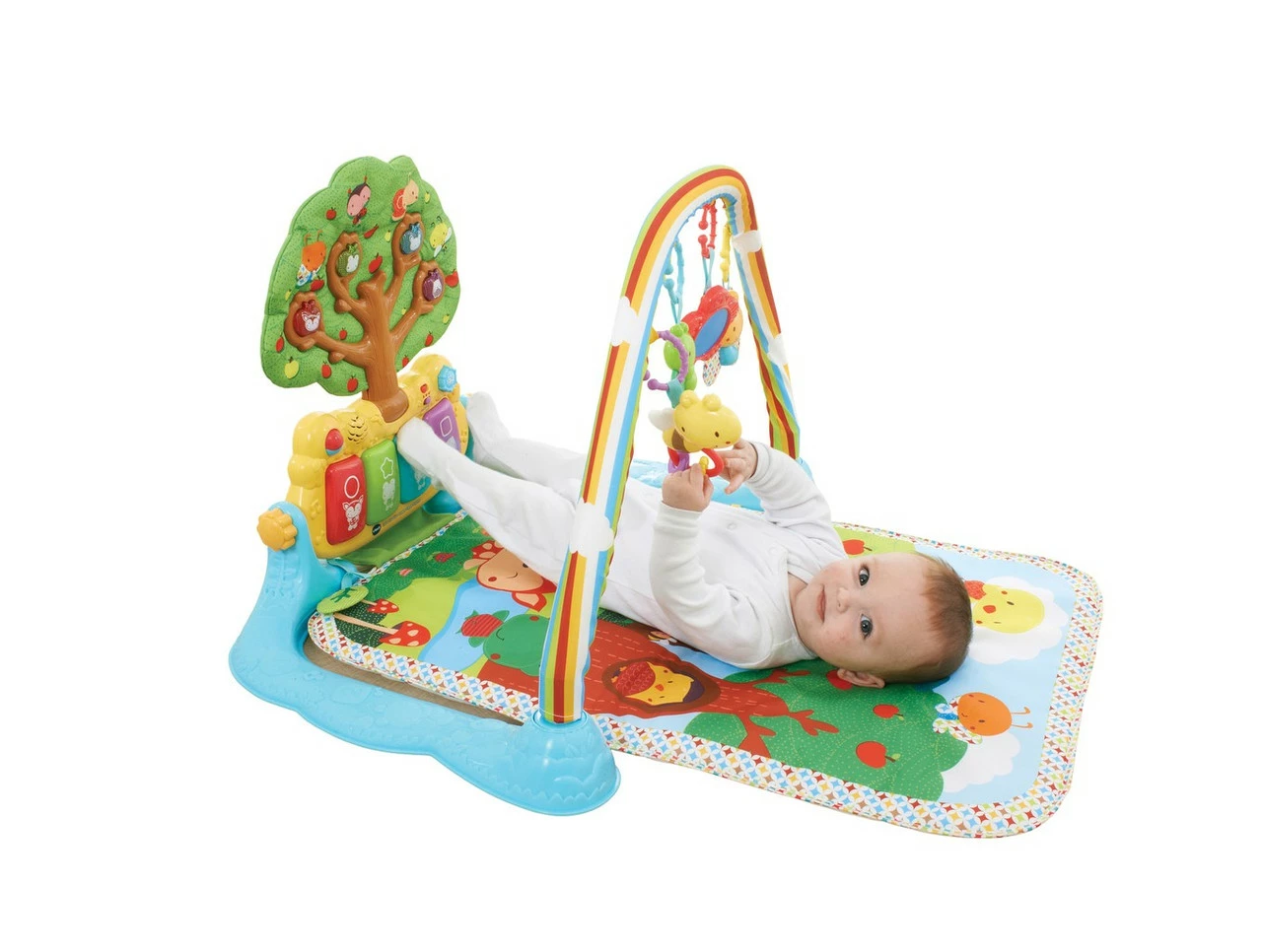 This beautiful playmat features a colourful rainbow arch with 3 attachment links for a hanging a mirror for self discovery, a dangling butterfly with crinkled wings for sensory development and a caterpillar teether for soothing baby’s gums. Beneath features a soft padded mat covered with the popular Little Friendlies characters to make play time comfy. Includes a detachable piano activity centre where baby can press the piano keys laying down or sitting and learn animals, shapes, sounds and colours in the 3 modes of play. The giant tree attracts baby with magical light-up apples. Features 20 melodies and 6 sing-along songs.
