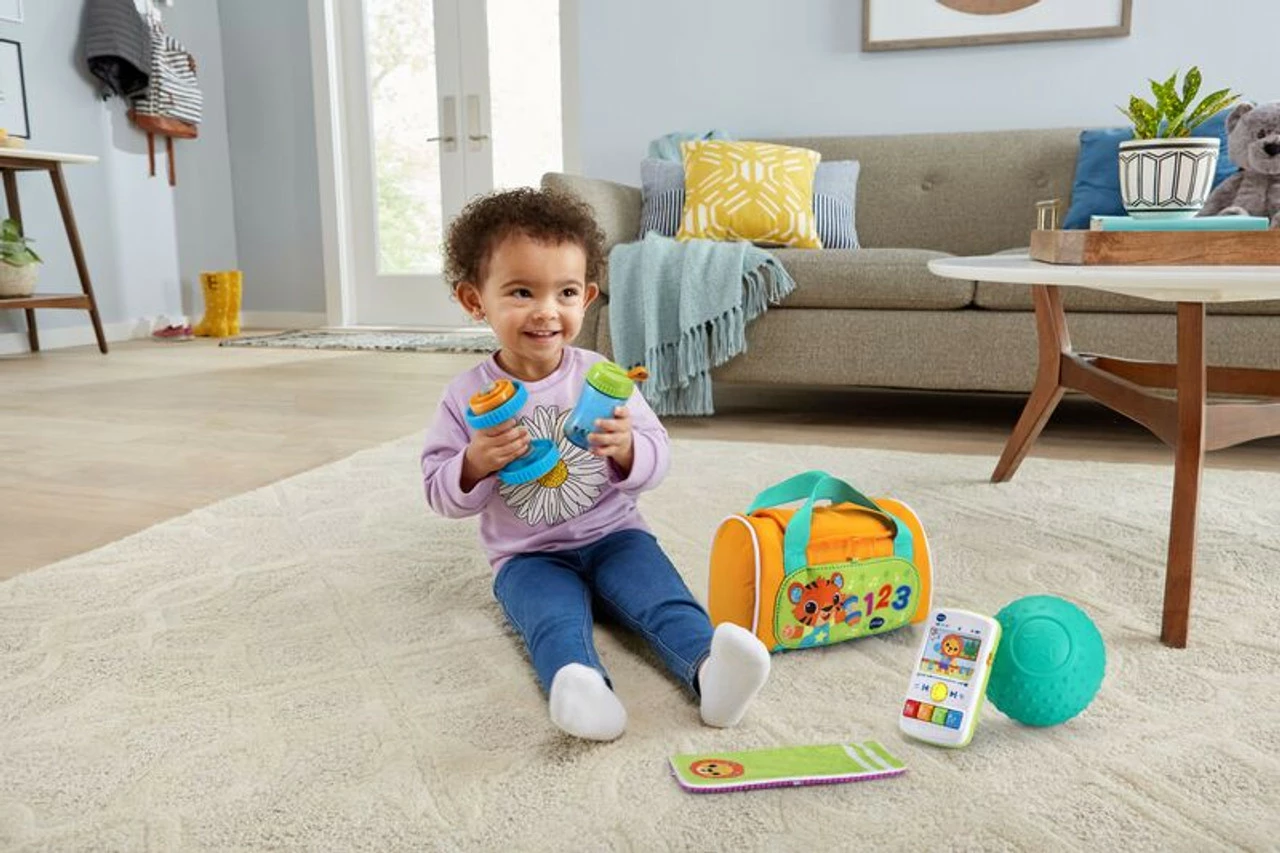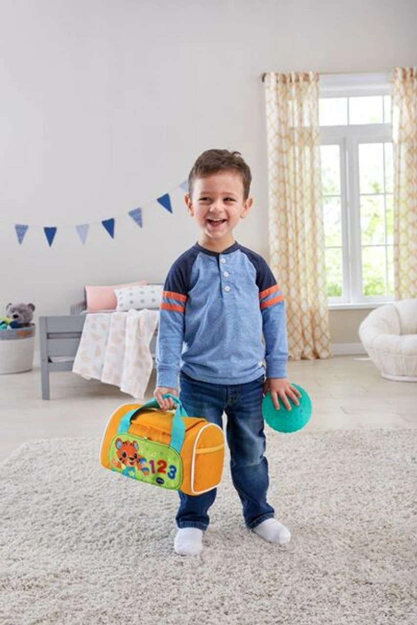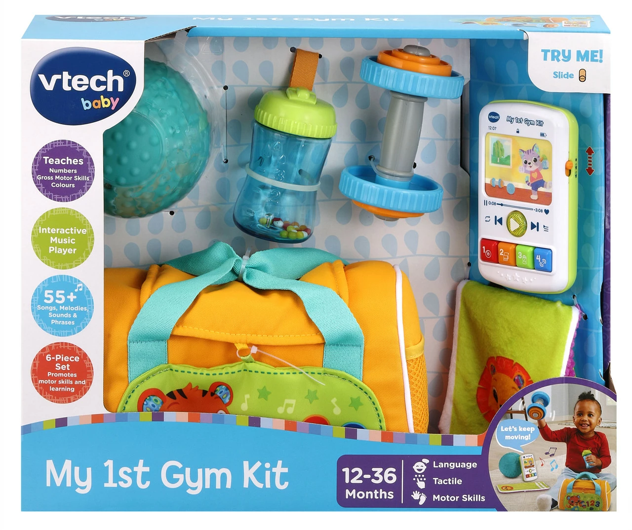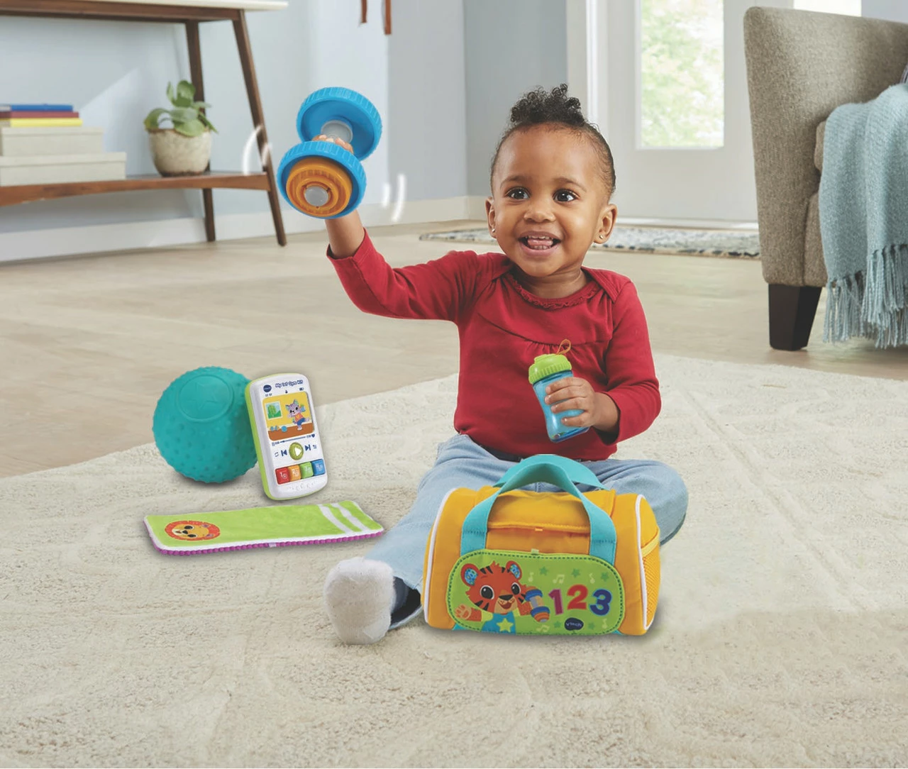 Highlights Pump up the fun with the My 1st Gym Kit! Strengthen motor skills with at-home pretend gym equipment designed for little ones. Description Brightly coloured workout gear includes a dumbbell, textured ball, water bottle rattle, crinkly towel and music player. Press the buttons on the music player and work out to three energising songs, 20 melodies and smart phrases that introduce numbers, objects, colours and more. Put all the accessories inside the fabric gym bag for storage at home or to carry everything on the go. Let’s keep moving!