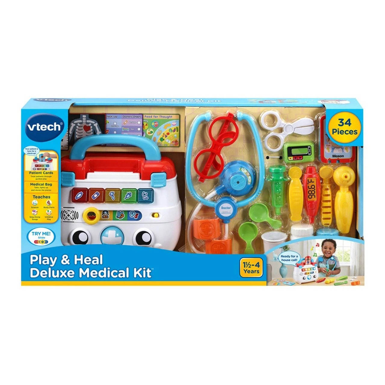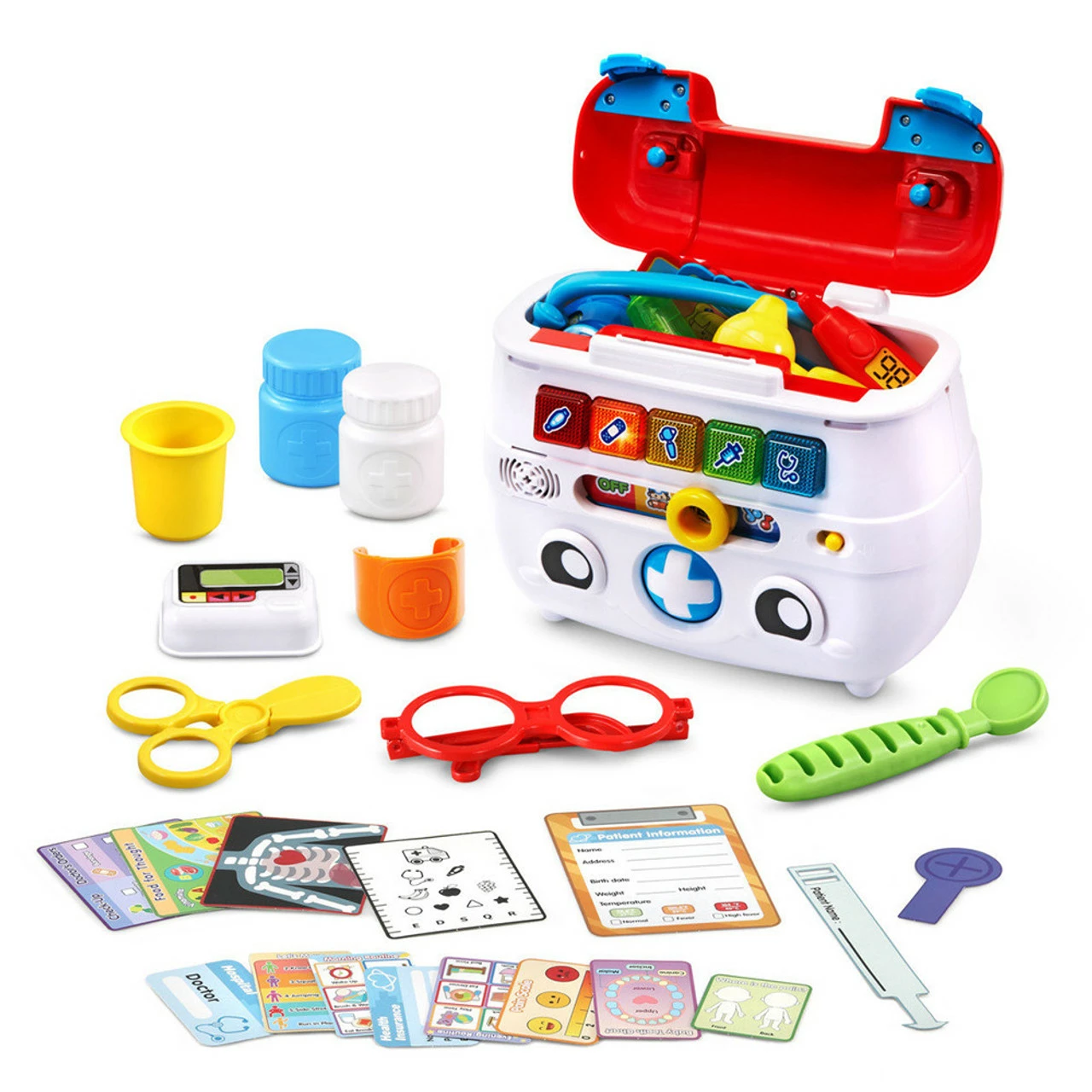 - Explore three fun activities and press the light-up buttons on the doctor’s kit to learn about medical tools, colors and objects; rolling ball makes the eyes on the doctor’s kit move.