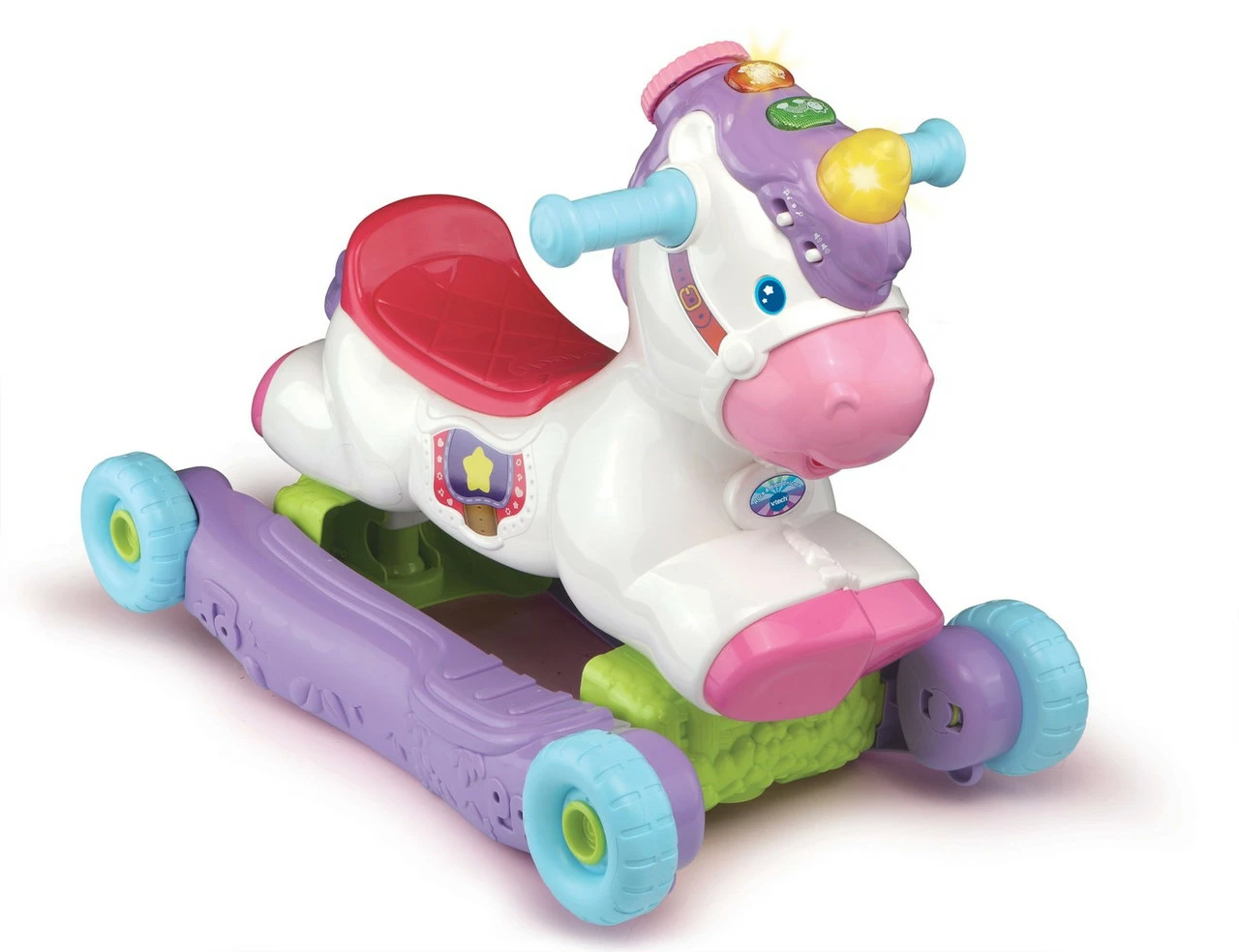Come on a magical adventure with the Rock & Ride Unicorn by VTech! Hop into the saddle and explore one of the two modes of play. The light up buttons introduces the unicorn itself and colours to your little one and enhance fine motor skill development and plays fun sounds to enhance listening skills and learning fun. Which also encourages language development and imaginative play. The motion sensor plays playful sounds to entertain baby when on the move. The unicorn plays 3 beautiful sing-along songs and 10 enchanting melodies and also has a magical light up horn.
