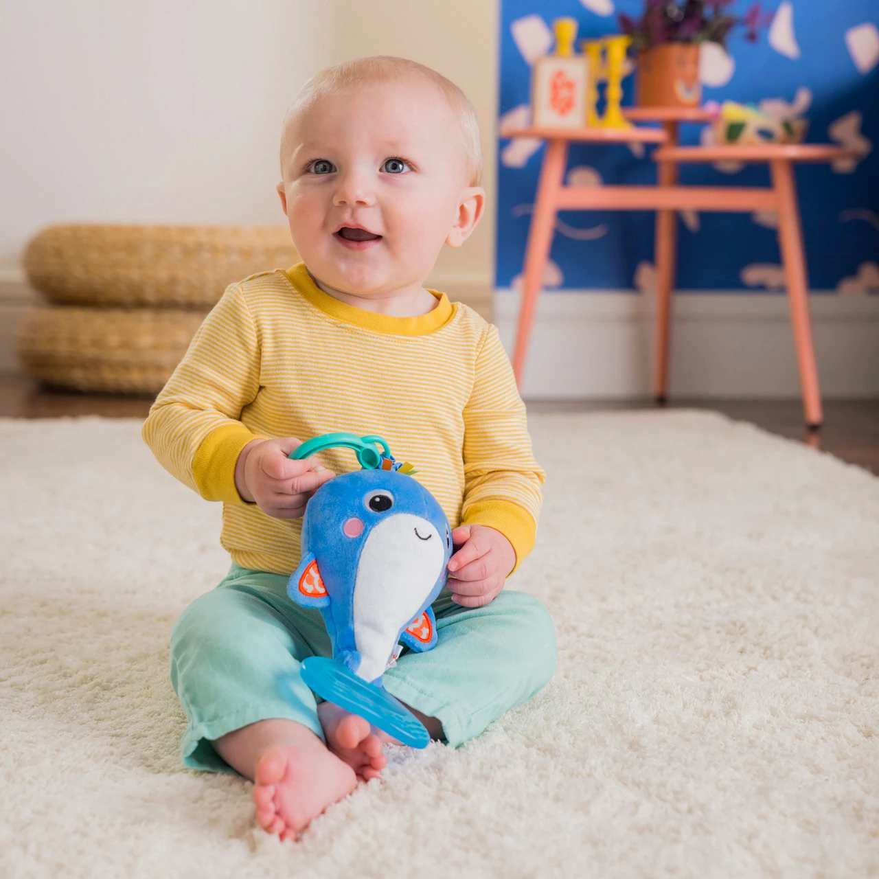 Playtime is a whale of sensory silliness with the Whale-a-roo from Bright Starts. Surprise baby with cause and effect by pulling on the whale tail for vibrations or giving it a shake for fun chiming sounds. Explore bright coloured ribbons and crunchy crinkly textures. This plush take-along toy brings plenty of activity on the go. AG13 Batteries Required; Included